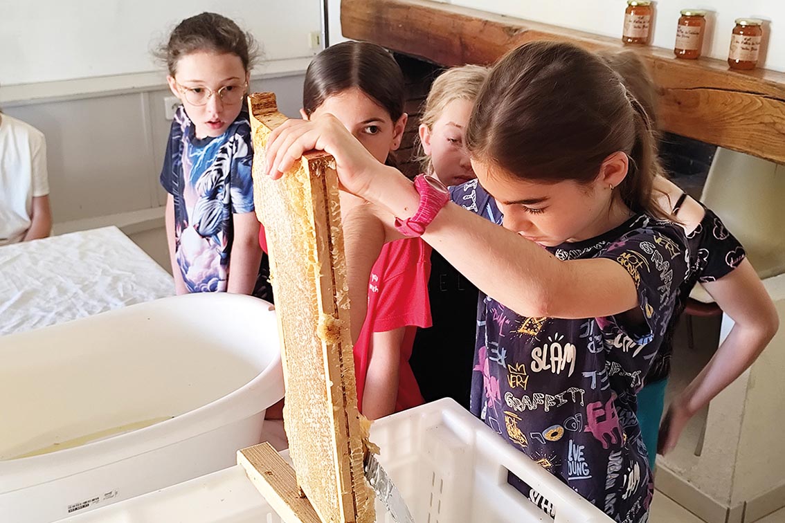 Le miel est ensuite récupéré dans un maturateur équipé de filtres, où il s’écoule lentement à travers un tamis pour éliminer les impuretés et les traces de cire. « Ce genre d’atelier leur permet de comprendre tout le cycle de production, de la fleur au pot de miel et de voir à quel point chaque étape compte. »